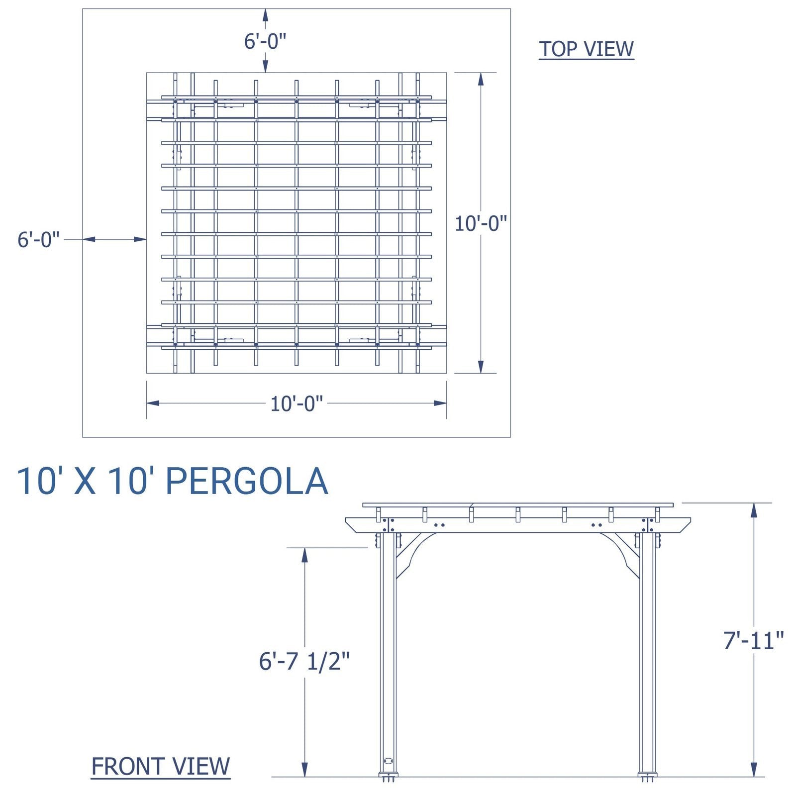 Turn your patio into a naturally shaded oasis by letting vines and roses grow across this pergola’s arbors. This beautiful 10′ x 10′ pergola is made from 100% cedar. Sculptured beams crisscross both directions and give it strength as well as flair. The four uprights are made from cedar, 5 1/2″ on a side. Our patent-pending decorative foot covers hide unique anchors that keep the pergola firmly secured to the ground or patio. The inside dimensions are 7′ x 7′ with a headroom of 6′ 7″ so there’s plenty of room for your patio furniture underneath. This pergola will give your patio wonderful, shaded, natural beauty that will let you enjoy hours of relaxation there.