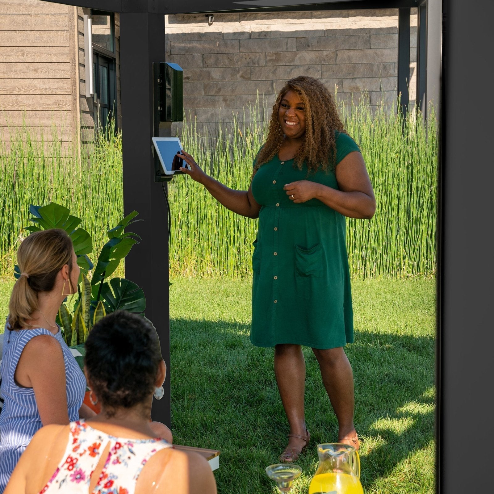 The Trenton steel pergola is Backyard Discovery’s solution to all weather, all season functionality and beauty in a stylish black finish. Our powder coated, galvanized steel construction makes the Trenton pergola maintenance free and rust resistant while offering protection against chipping, scratching, corrosion, and UV harm. The Trenton is a Pro-Tect™certified performance structure; certified to withstand up to 100 mph winds. With a sail shade soft canopy included; the Trenton pergola is a minimalist outdoor structure design with modern, durable steel composition. Backed by a 5-year limited warranty, our high-quality steel pergolas provide market leading strength and durability in comparison to aluminum or vinyl outdoor shade products. Offered in 4 sizes, the Trenton steel pergola provides up to 192 sq. ft. of shade and plenty of room for furniture, fire pits, and entertaining. The exclusive PowerPort ™ has 3 USB ports and 3 electrical outlets to use for powering outdoor lights and electronics as well as charging your devices. If you have been searching for a strong, weather resistant, modern styled pergola, look no further. Meet the Trenton galvanized steel pergola by Backyard Discovery!