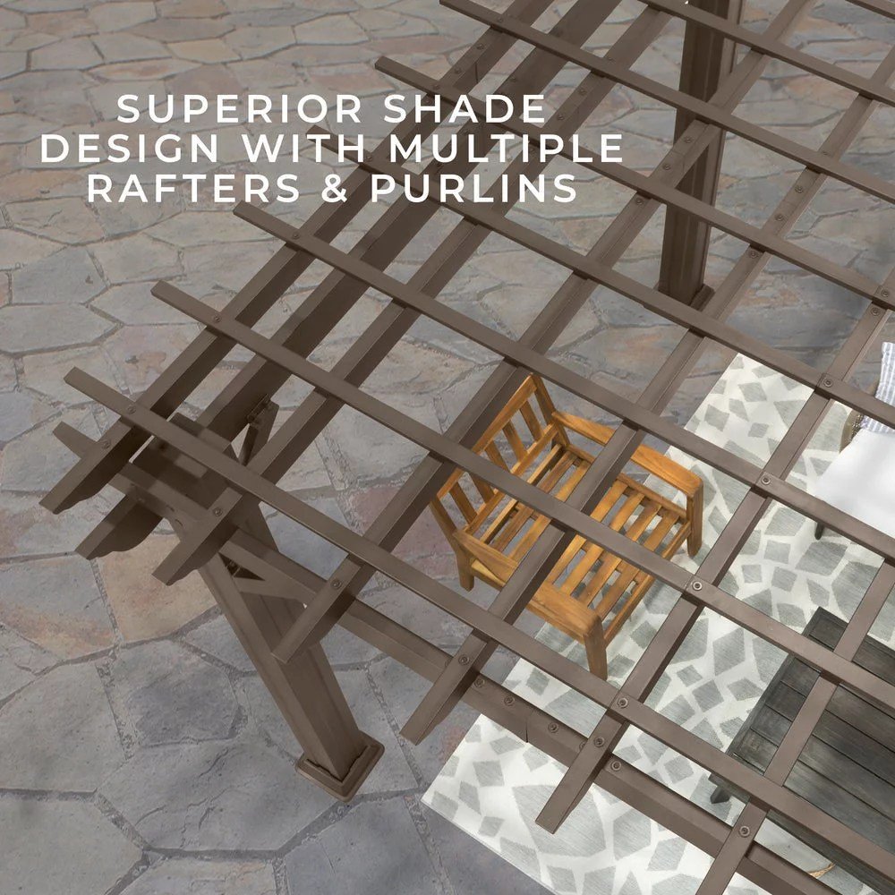 The Ashford Steel Pergola is Backyard Discovery’s state-of-the art addition to our patio collection, in a Classic Brown Finish. Our powder coated, galvanized steel construction makes the Ashford pergola maintenance free and rust resistant while offering protection against chipping, scratching, corrosion, and UV harm. You can be confident in the Ashford as it is a Pro-Tect™certified performance structure; certified to withstand up to 100 mph winds. The Ashford Pergola preserves the classically inspired appearance of a traditional outdoor structure design with modern, durable steel composition. Included is a light filtering sail shade soft canopy. Backed by a 5-year limited warranty, our high-quality steel pergolas provide market leading strength and durability in comparison to aluminum or vinyl outdoor shade products. Offered in 4 sizes, the Ashford steel pergola provides up to 192 sq. ft. of shade and plenty of room for furniture, fire pits, and entertaining. The exclusive PowerPort™ has 3 USB ports and 3 electrical outlets to use for powering outdoor lights and electronics as well as charging your devices. If you have been searching for a strong, weather resistant, traditional styled pergola, look no further. Meet the Ashford Galvanized Steel Pergola by Backyard Discovery!