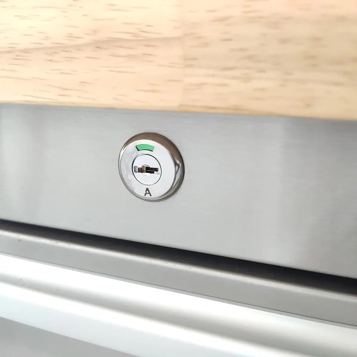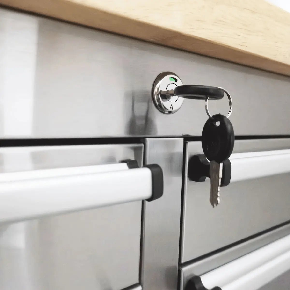 This bench features heavy-duty lockable wheels and 15 lockable sliding drawers with dual sliders on the bottom drawers. The mobility and security of this workbench make it incredibly adaptable to any kind of professional work or hobby environment.