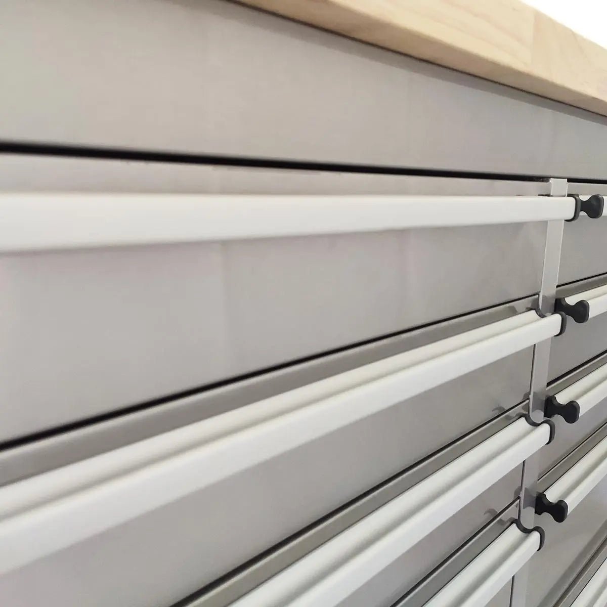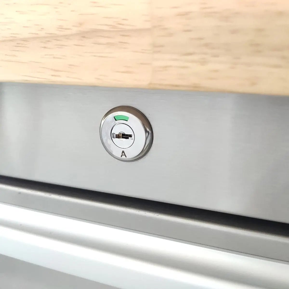This bench features heavy-duty lockable wheels, 10 lockable sliding drawers and one locking cabinet with interior shelving for bigger parts and tools. The mobility and security of this workbench make it incredibly adaptable to any kind of professional work or hobby environment.