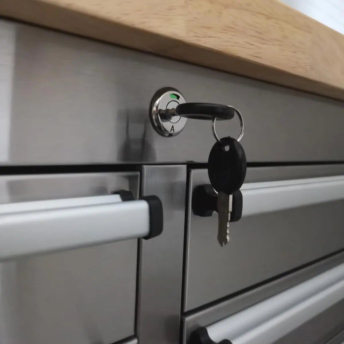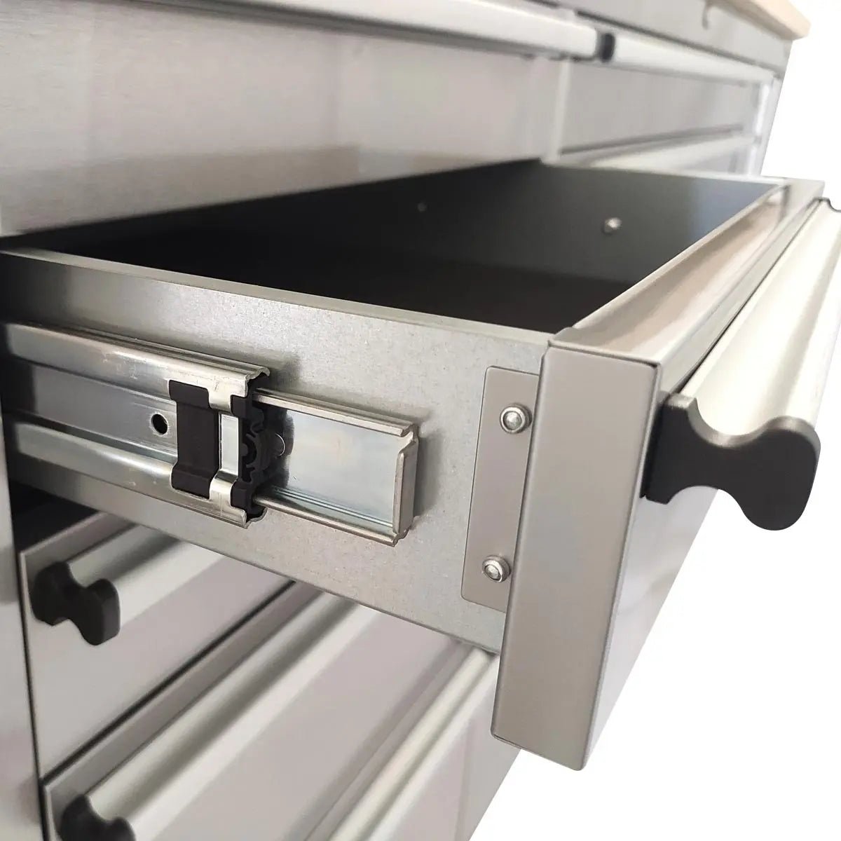 This bench features heavy-duty lockable wheels and 24 lockable sliding drawers with dual sliders on the bottom drawers. The mobility and security of this workbench make it incredibly adaptable to any kind of professional work or hobby environment.