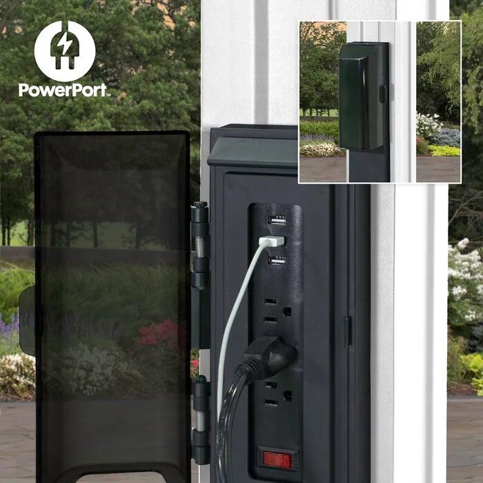 - Exclusive PowerPort has three electrical outlets for lights, TVs, and more as well as three USB ports to charge devices. Exclusive PowerPort has three electrical outlets for lights, TVs, and more as well as three USB ports to charge devices. Overall7′ 8 9/16” H x 12′ 3/16” W x 16′ 13/32” DInterior Space6′ 11 7/32” H x 10′ 11 5/16” x 7′ 8 7/32” DPosts7′ 4” H x 6” W x 6” DOverall Product Weight