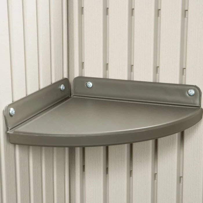 The dual entry 14 ft. 7.5 in. W x 7 ft. 8.7 in. D plastic storage shed provides the perfect storage space for all your tools. This dual entry is the perfect addition to your outdoor space and keeps your tools well-organized. Dd plastic storage shed by lifetime is constructed from steel, HDPE polyethylene plastic that offers years of reliable use. The gable roof lends a traditional style to the garden shed. The desert tan and dark brown finish of the tool shed lends a classic look to it and enhances its overall appearance. It includes two polycarbonate windows with shutters, double doors, two shelves, four corner shelves, two peg strips with tool hooks. The screened vents provide airflow and keep the shed pest free. The high-density and slip-resistant plastic floor provide excellent stability and easier access to tools. It is water and weather resistant that makes it endure most weather conditions. The storage shed is easy and quick to assemble. It is easy to care for and can be wiped with a dry or wet cloth to keep clean. This storage shed is manufactured in the united states.