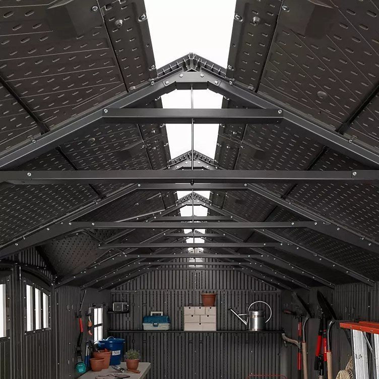 Model Number: 60318 Color: Brown and Gray Shades Floor Color: Black Material of Construction: High-density polyethylene (HDPE) plastic and weather-resistant powder-coated steel Walls: Steel reinforced, double-walled polyethylene plastic Doors: Two sets of double doors with internal spring latches, interior deadbolts, and exterior padlock loops Windows: Two 16.5″W x 16.5″H Polycarbonate Windows with Shutters (Opens Half-Way) Screened Vents: Two Screened Vents Skylights: 6 Small Skylights Floor: Slip and Stain Resistant Heavy Duty Polyethylene Shelving Units: One 90 x 9 inch shelf, two corner shelves, 12 wall hooks Warranty: 10 year Limited Warranty!