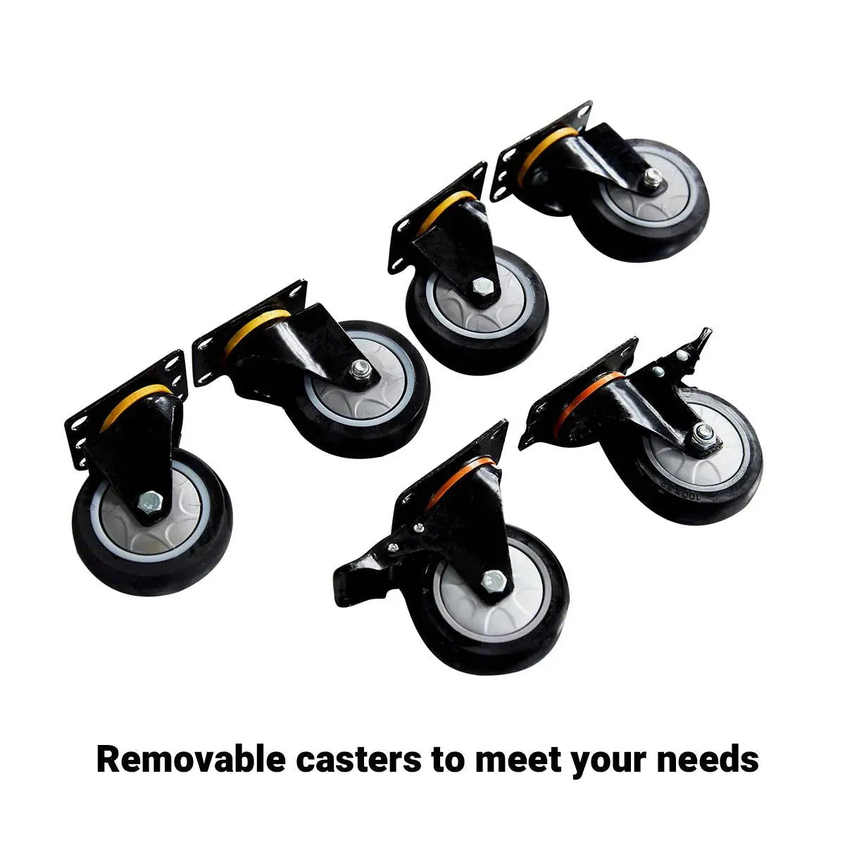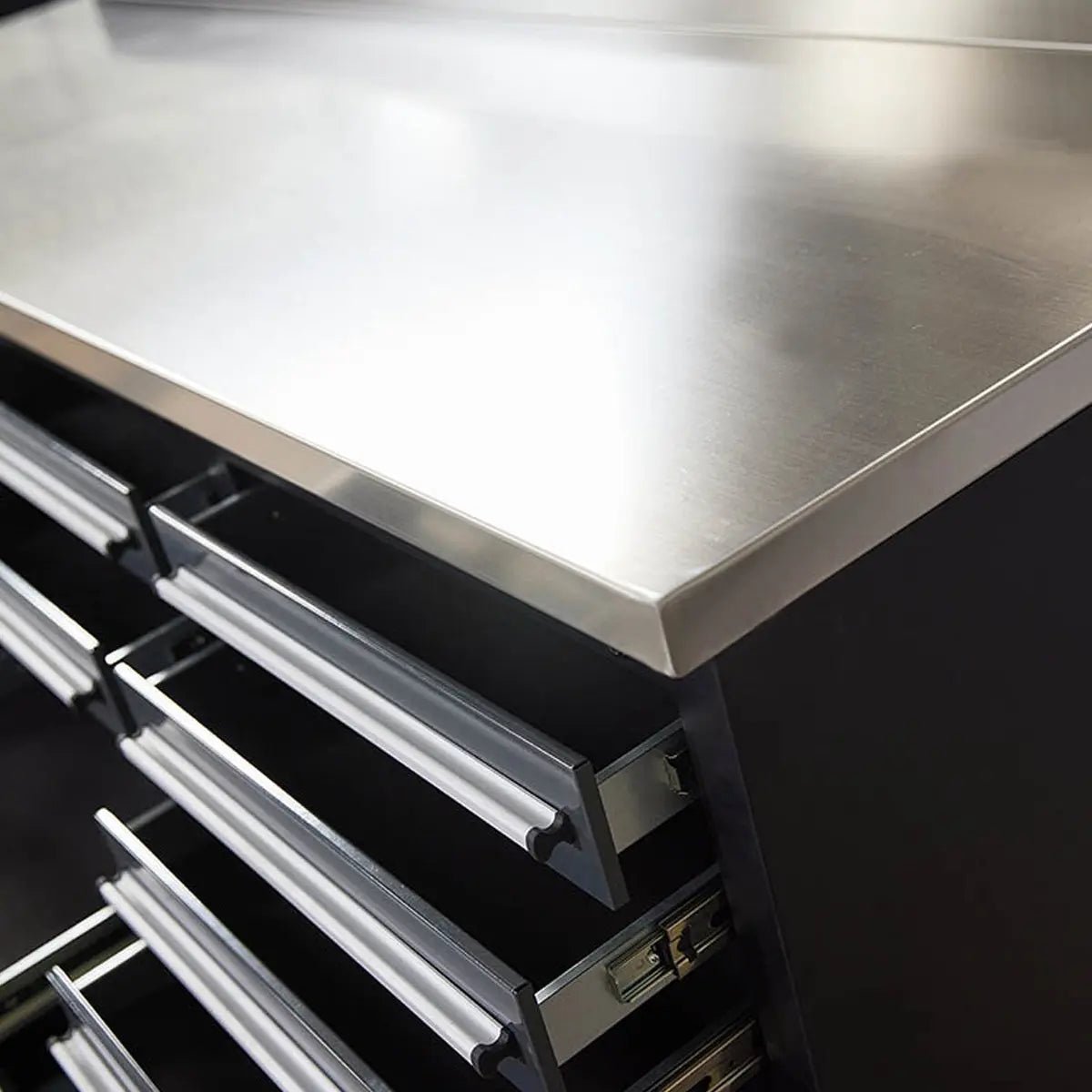 Its all-steel welded frame and 1.5mm stainless steel work surface offer industrial-grade strength, while the 4″ back lip ensures a tidy workspace. With a mix of skinny, medium, wide, and large drawers rated for up to 400 lbs, you’ll have tailored storage space for your every need.