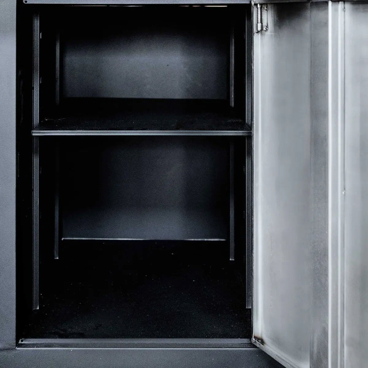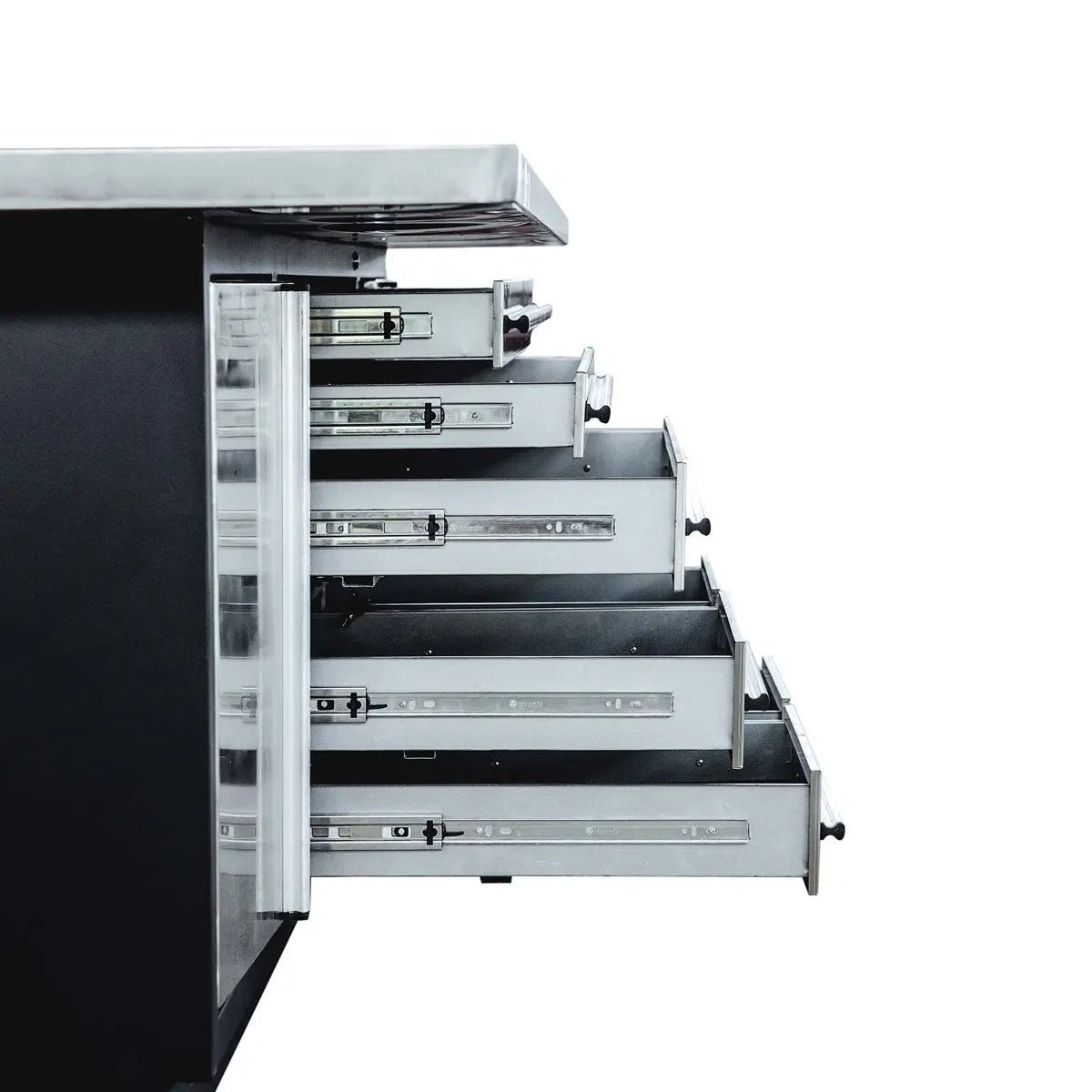This bench features seven heavy-duty lockable sliding drawers and two locking storage cabinets with adjustable shelving. The security of this workbench makes it incredibly adaptable to any kind of professional work environment and is built to last with a powder coated finish.