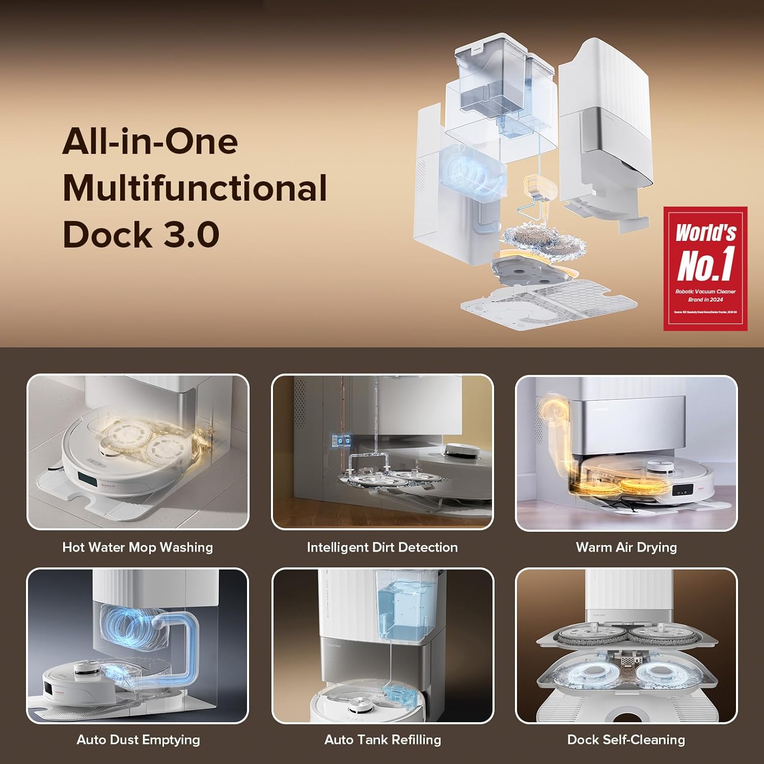 - Master-Class Maintenance-Free Experience: All-in-One Multifunctional Dock 3.0 with hot water. Up to 167℉, hot water mop washing and self-cleaning bring cleaning to the next level, easily getting rid of stubborn stains and maintaining a spotless home environment. A dust bag as large as 2.7L supports over 60 days of hassle-free cleaning.
