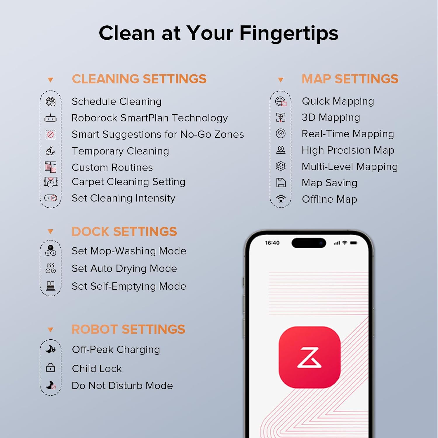 - Control at Your Fingertips: Manage all things with the upgraded Roborock app. Advanced AI algorithms ensure smarter, stress-free cleaning. Diverse functions, including routines, map details, washing temperatures, drying duration, and maintenance conditions, are easily managed in the app.