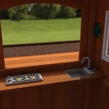Begin with an invigorating stint on the two belt-swings or two-person glider. Next, hike up the rock wall or ladder straight to the spacious upper fort. Then, take the 10’ slide back down the mountainside to the fully equipped lower fort, complete with play kitchen, cordless phone & built-in snack service area. An homage to the mountain houses you would find in the illustrious national park, the Shenandoah swing set isn’t just family fun, it’s also a handsome addition to your landscape with its hourglass windows, sunburst gables, sloped wood roof & other cabin-esque architectural details.