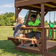 The Sky Fort II will elevate your children’s imaginations — and your landscape. With raised clubhouse, roomy porch, and crow’s nest complete with its own telescope, this towering play and will feel like their own wooden castle. And there are plenty of fun, safe ways to move around this personal palace: a full length of monkey bars swings them straight into the raised clubhouse, a challenging rock wall allows them to climb directly onto the porch, and a 10 foot wave slide slithers them right back down.