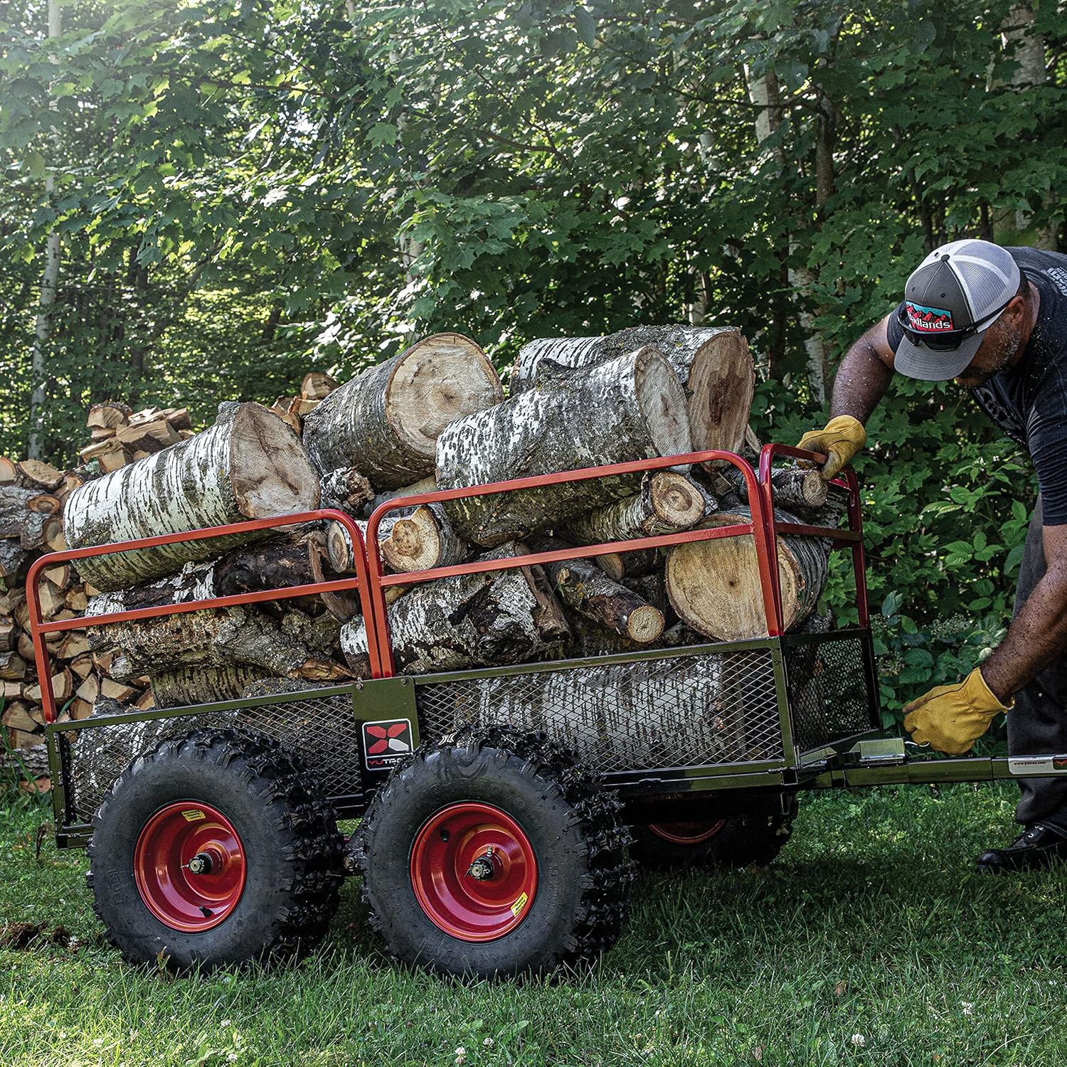 - Pivoting and tilting bed for easier loading and unloading. Pass-through axle eliminates the chance that brush will get caught to keep you moving down the trail smoothly. Large knobby flotation tires help absorb shock and provide additional traction and stability.